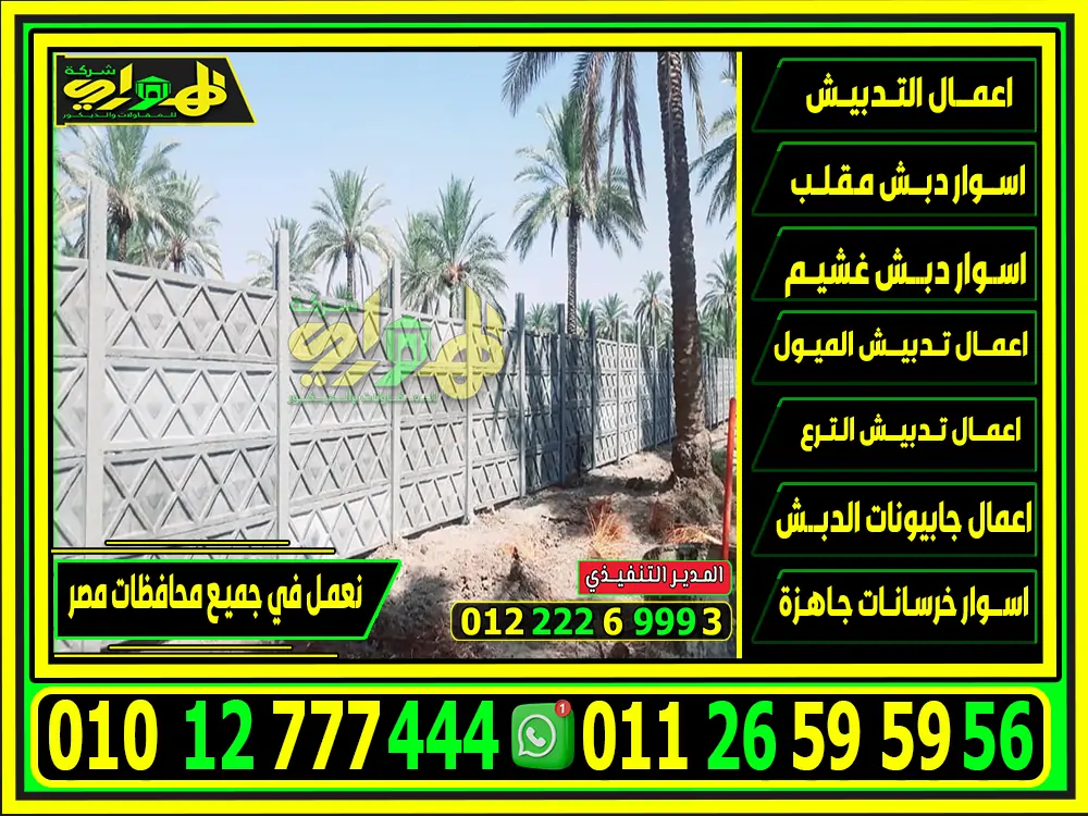 اتصل بنا على أرقام شركة الهواري للمقاولات والتوريدات 01012777444 – 01126595956 إذا أردت الحصول على اسوار خرسانية جاهزة ذات متانة وجودة عالية تستخدم في أغراض التأمين والحماية وتزيين ديكورات المباني المختلفة، نجمي ممتلكاتك وحديقة منزلك أو الفناء الخارجي للفيلا من الحيوانات الضالة والفئران والسحالي وغيرهم، ومن مراقبة المارة والجيران لك عند الجلوس بالحديقة مع الأسرة، بتركيب أسوار خرسانية مسبقة الصنع تتمتع بقوة فائقة، مستخدمين في تصنيعها مواد خام عالية الجودة.